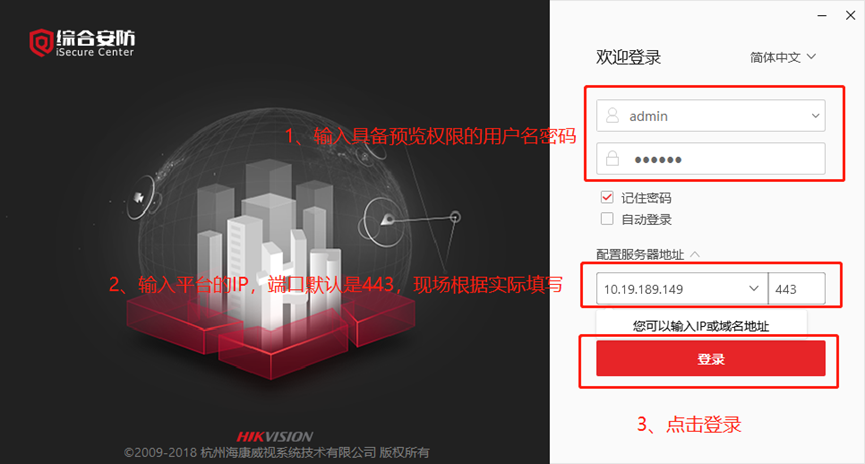 01 综合安防管理平台提供CS客户端,可以双击运行客户端,输入用户名和密码以及平台的IP地址,端口默认443,然后点登录: