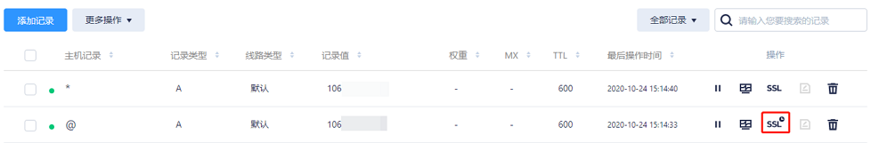 2. 单击 DDNS 域名,进入“记录管理”页面,检查该域名的 DDNS 记录值是否为群晖 NAS(Synology)中获取到的公网 IP 地址。确认无误后鼠标覆盖在 SSL 上,单击悬浮框中的免费申请。如下图所示: