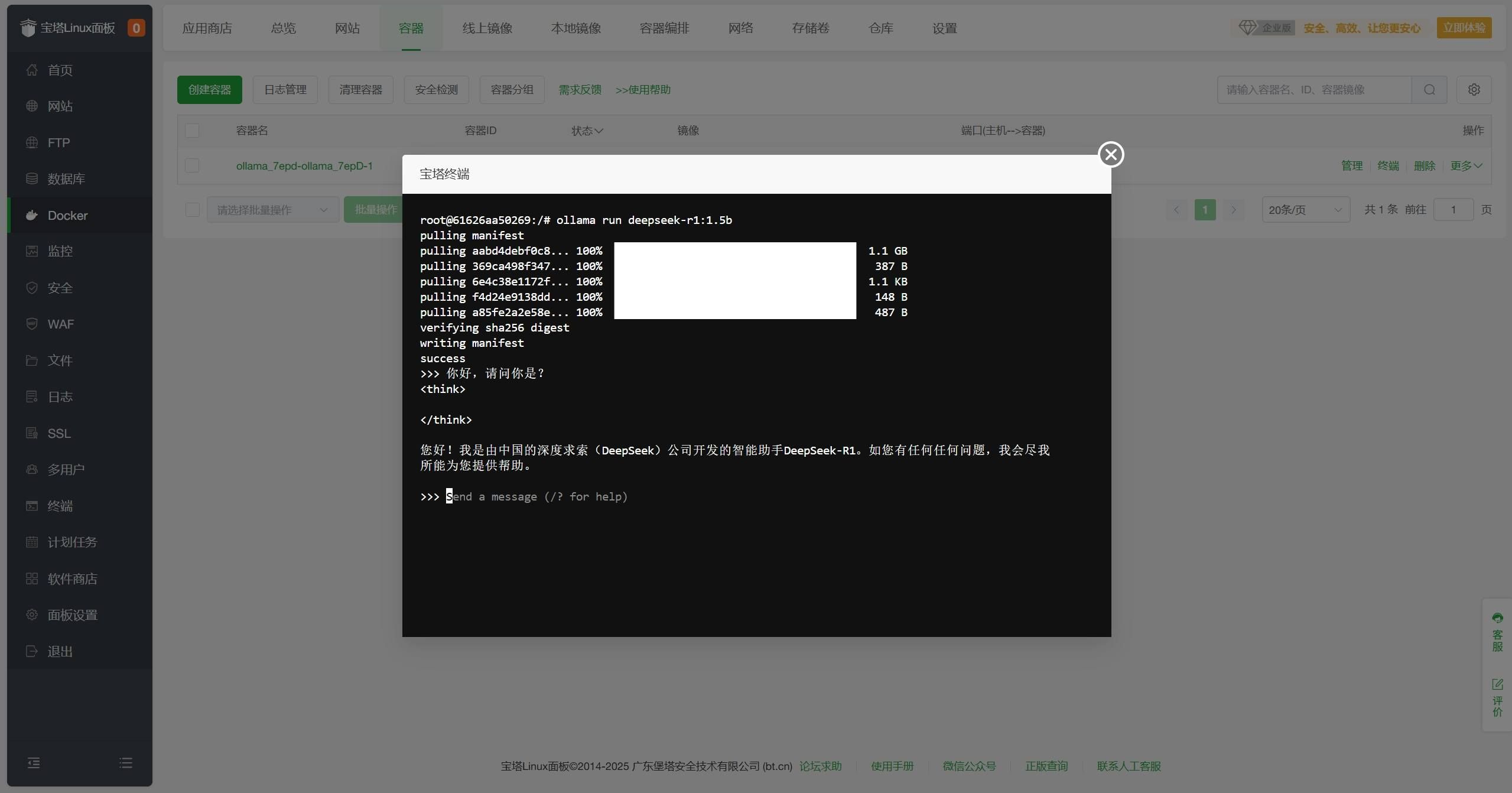 宝塔面板-Docker-容器界面中找到Ollama容器,点击终端。
