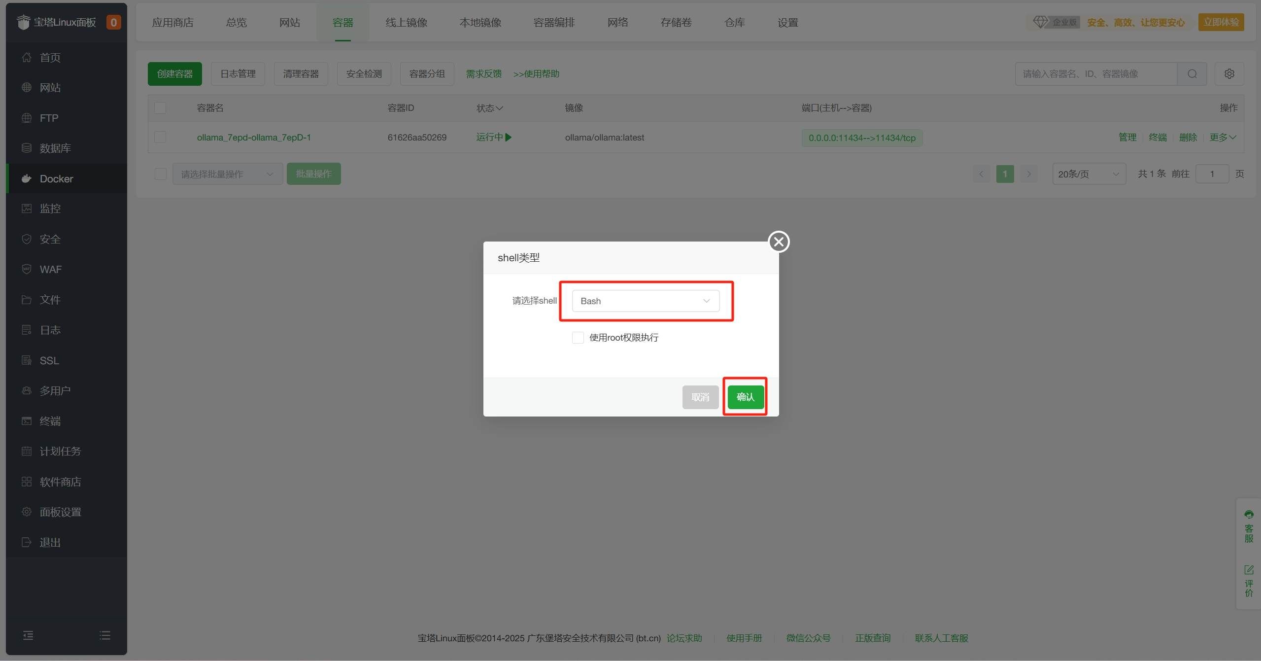 宝塔面板-Docker-容器界面中找到Ollama容器,点击终端。