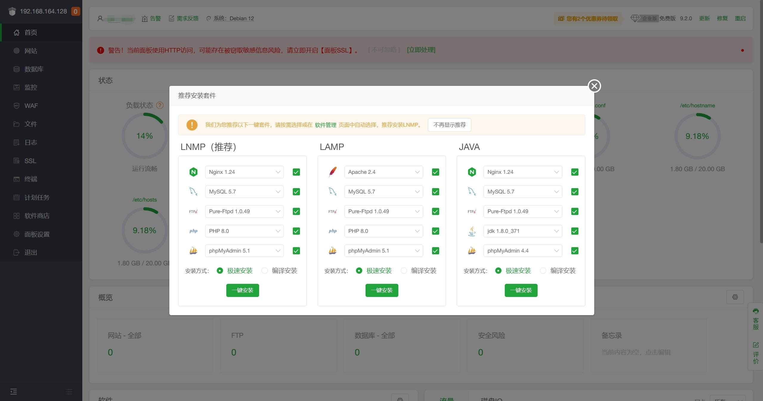 首次登录会提示安装基础环境,根据需要选择安装,推荐LNMP环境。