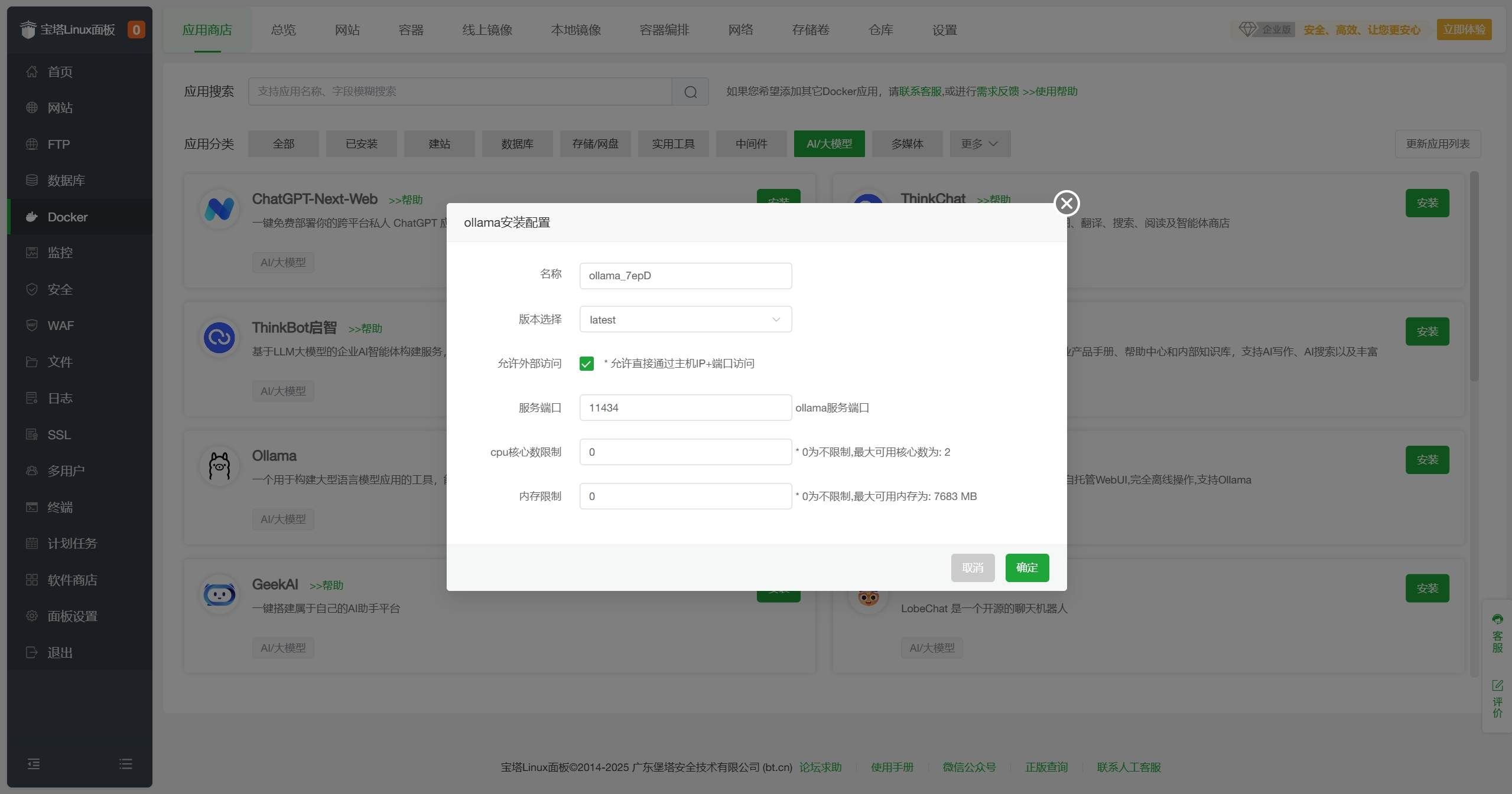 在Docker-应用商店-AI/大模型分类中找到Ollama,点击