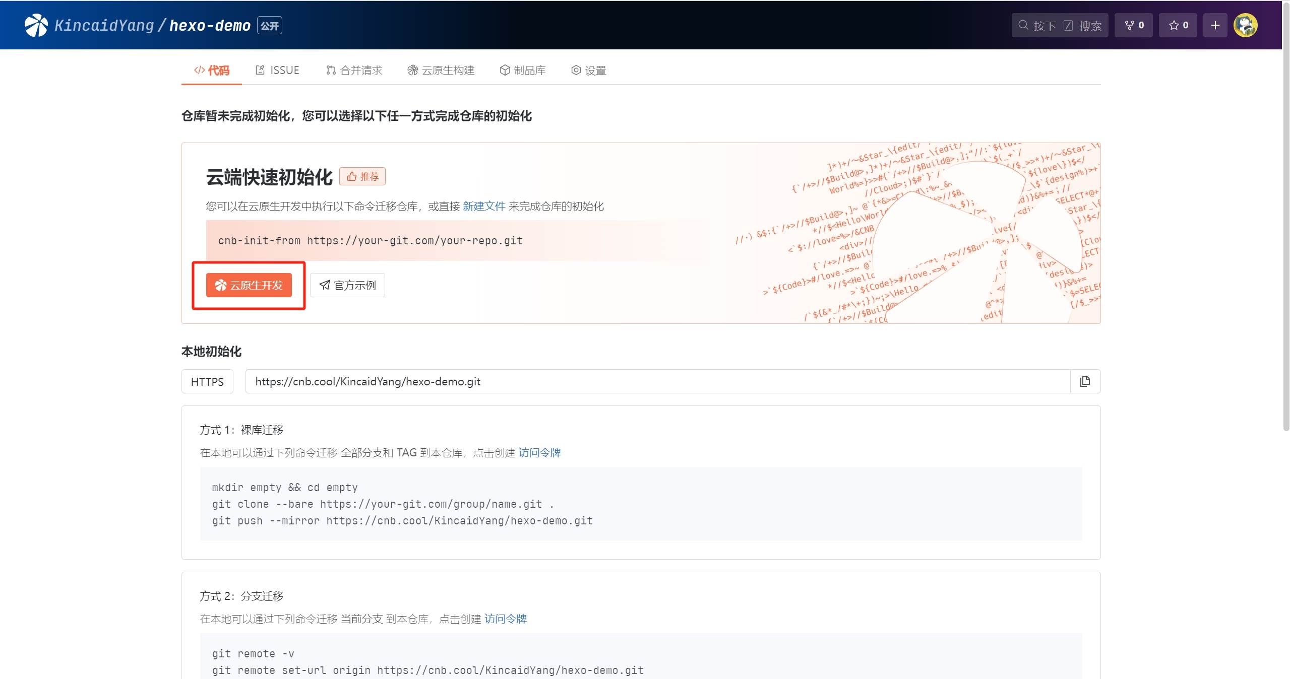 仓库暂未完成初始化,您可以选择以下任一方式完成仓库的初始化,这时点击云原生开发