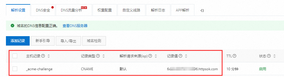 添加DNS记录,注意:【主机记录】、【记录类型】、【记录值】和上一步的一一对应。