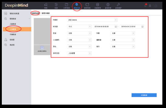 →智能检索→人体检索→按属性检索”,选择对应通道,设置检索时间,设置对应属性检索条件,如图6-18所示;点击“开始检索”即可检索出满足检索条件的人体图片,如图6-19所示。