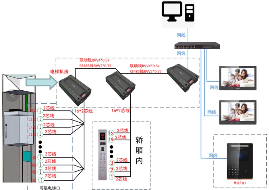 对接方式2——RS485方式:梯控主机(DS-K2210)和呼梯模式梯控分控模块(DS-K2M0016A)都放在轿顶机房。梯控主机(DS-K2210)的485口和门口机485口用RVV线连接。
