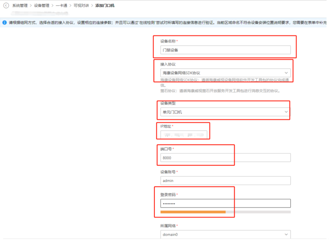 填写设备信息,包括设备名称、设备类型、接入协议、IP地址、端口号、设备账号、登录密码和所属网络。