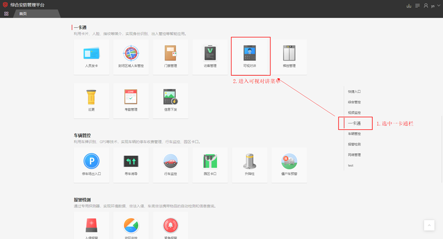 平台门户页面选择“一卡通”栏,单击“可视对讲”图标进入可视对讲菜单。