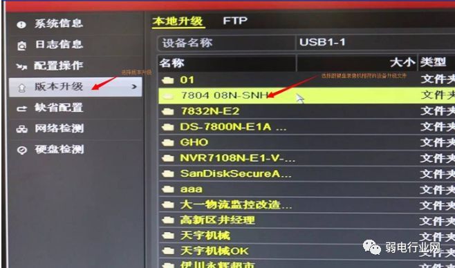 5、在系统维护中选择版本升级,选择与硬盘录像机一直的版本升级文件。