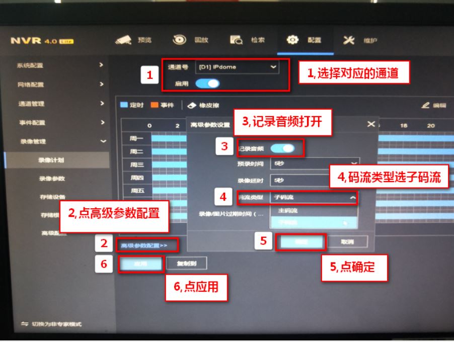 选择对应的通道,点击“高级参数配置”,进入到高级参数设置界面,码流类型选择“子码流”,把记录音频打开,点“确定”,点“应用”。