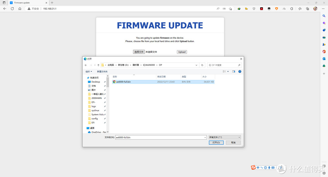 点击选择文件的按钮,选择我们下载的OpenWRT固件,然后打开。