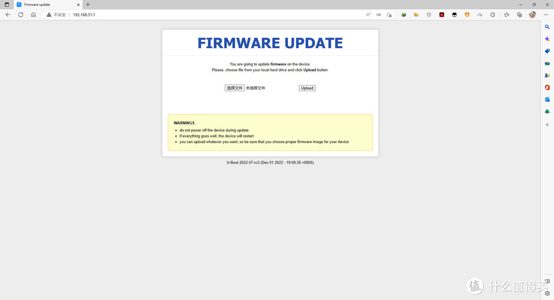 在浏览器地址栏输入:192.168.31.1,能看到下面的页面就证明成功进入了uboot,如果没成功的话就重复上面的步骤,断电重启路由,按住RESET开机,15秒松开,再次尝试,直到能看到下面的页面为止。