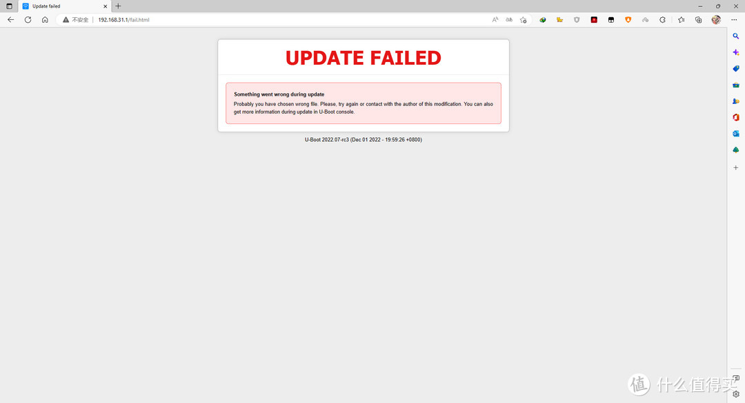如果看到升级失败的页面也不用担心,重复上面的刷机操作,再次写入OpenWRT固件文件。