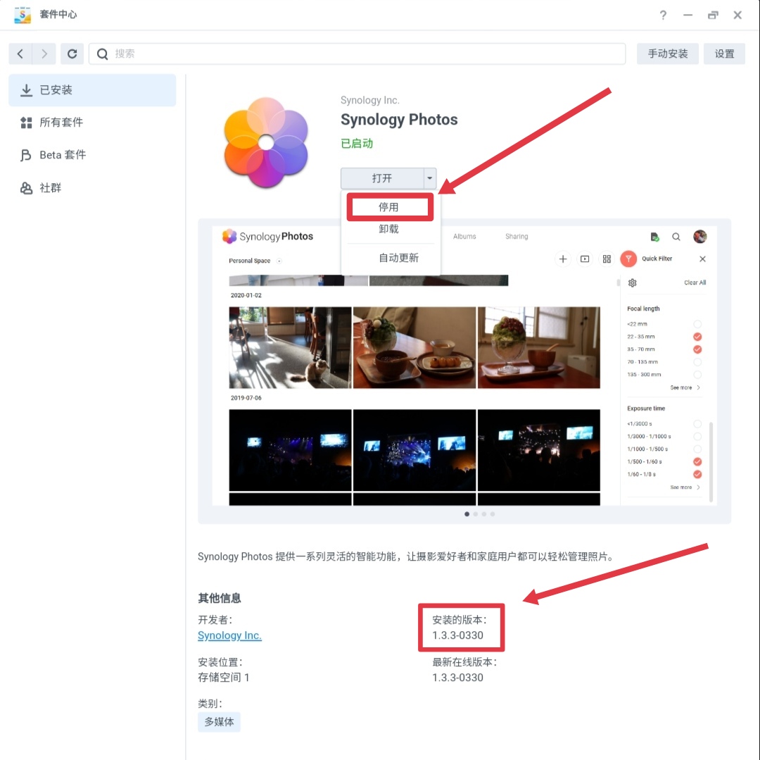 一、打开群晖套件中心,已安装,找到Synology Photos,点开,然后点下拉菜单,停用;