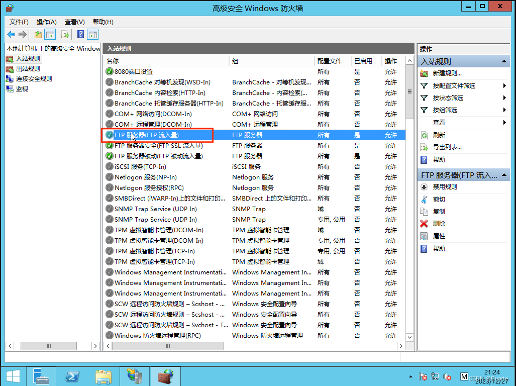 服务器管理器 -> 配置 -> 高级安全windows防火墙设置 -> 入站规则