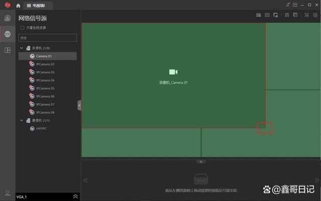 解码上墙成功后,点击右上角的窗口分割图标,选择对应的分割数,拖动设备信号源到窗口即可。