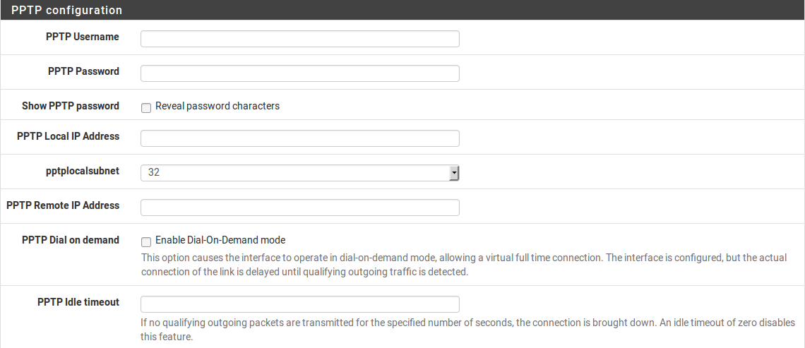 指定断开连接前pfSense使PPPoE连接保持不发送数据的时间。仅当与按需拨号结合使用时,此功能才有用,并且通常留空(禁用)。