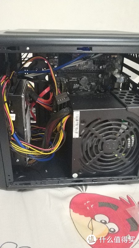 所谓一看就会一做就废,我这种十几年装机经验的垃圾佬来说并不难。机箱支持背线和前面板走线。可惜电源线不够长,所以背线这个事还是请各位看官不要太较真了,毕竟没钱买定制线的电源。电源风扇是大风车,一定要注意不能把风扇对着cpu这样会抢cpu的风道。正确的做法还是参考官方说明,把电源风扇朝向侧面板,外界的空气直接吸入电源给电源降温。机箱内我安装了一个12厘米风扇和一个8厘米风扇,形成下吸上排的风道,如果发热不太大风扇可以不装或者只考虑顶部安装12厘米风扇将机箱内部的热空气尽快抽出去,这个效果比底部进冷空气的效果更明显。机箱原设计只能安装1块2.5寸硬盘和1块3.5硬盘,经过我一顿骚操作已经安好2块2.5寸硬盘和1个3.5硬盘,至于未来第4块的位置,我已经想好放在电源上,硬盘顶盖倒扣,贴上橡胶脚垫隔绝震动。