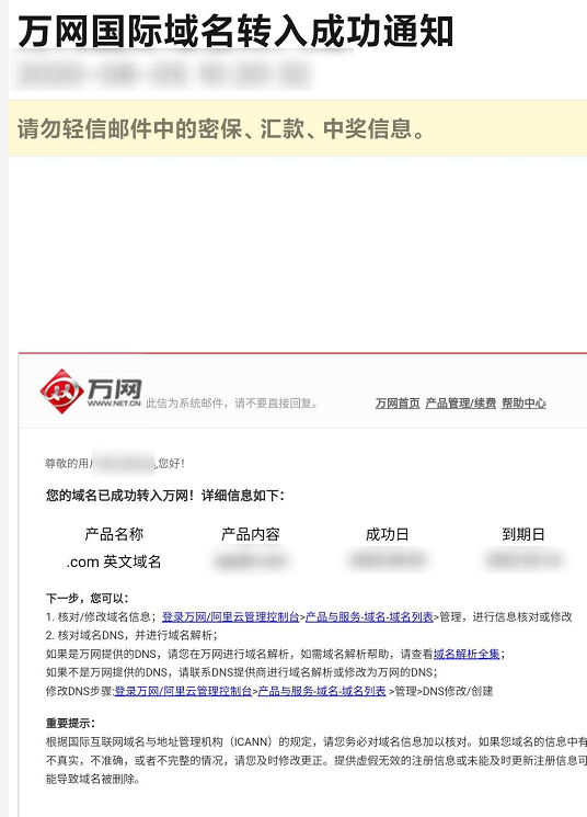下面跟着提示和询问继续走,邮箱和手机收到验证码,填验证码之类,选择接收方的时候是【万网】,万网就是阿里云的另外一个名字。
