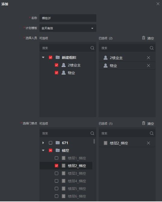 5、权限下发:访问控制-权限管理-权限组-添加权限组,选择对应的人员和梯控楼层,确定后,选择异动下发,下发成功即可正常使用。