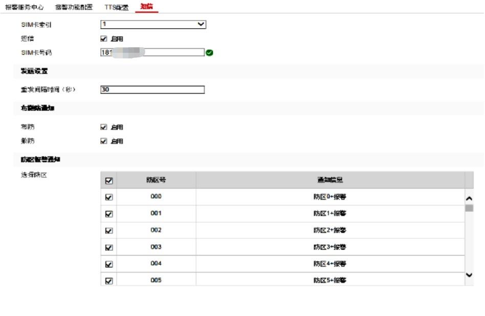 2、选择 SIM 卡索引,输入接收短信的电话号码,选择重发时间间隔,选择是否要启用防区布撤防提醒,选择需要进行短信报警提示的防区,点击“保存”。