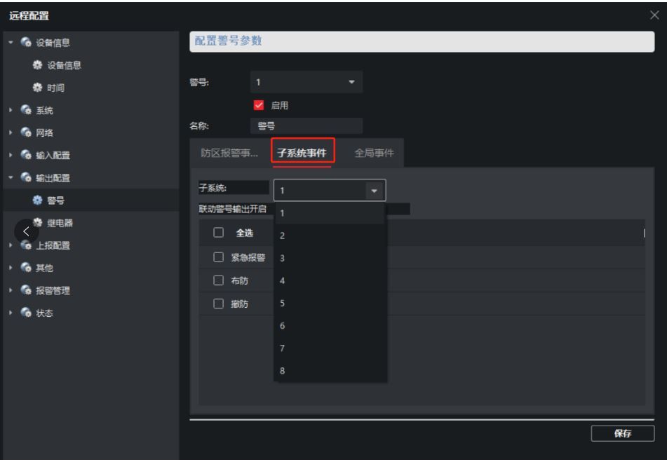 子系统事件: 可针对不同子系统,当对子系统进行操作(紧急报警,布撤防)后联动警号触发(默认不需要勾选)。