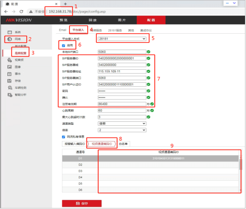 (3)配置GB28181接入服务器的信息。(以下配置信息根据申请的序列号表格对应填写)