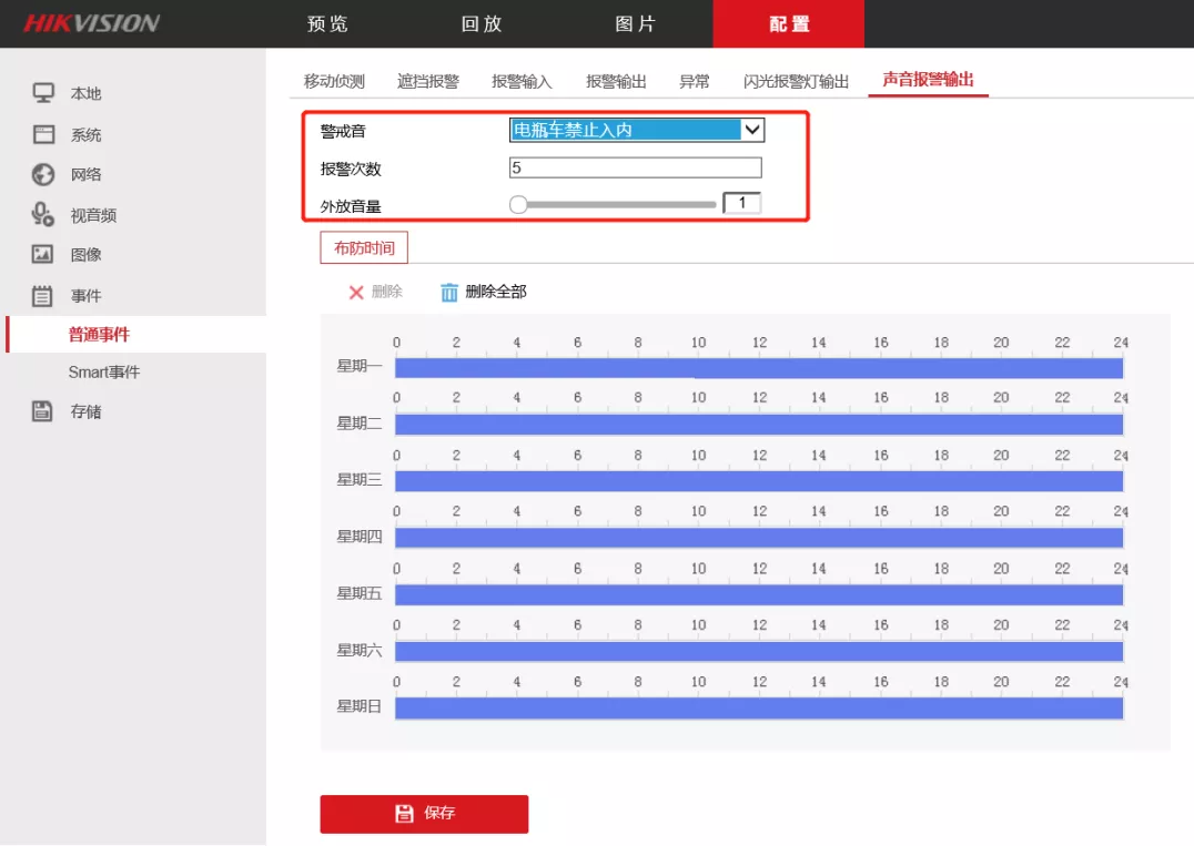 根据现场实际需要对声音报警输出进行配置:进入事件-普通事件-声音报警输出页面,选择合适的警戒音,如电瓶车禁止入内等。配置好报警次数和满足需要的外放音量。最后设置好布防时间(默认 7 x 24h)。