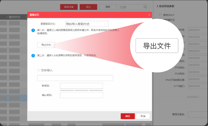 5、回到设备网络搜索软件中,选择文件导入,设置新密码和确认密码即可
