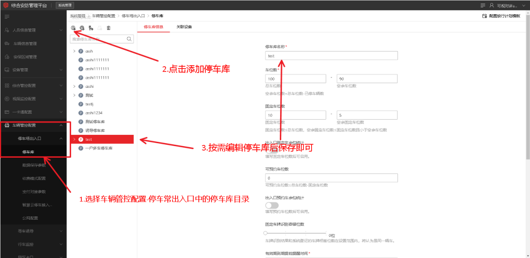 01 进入车辆管控配置→ 停车场出入口 → 停车库,对停车库进行添加保存: