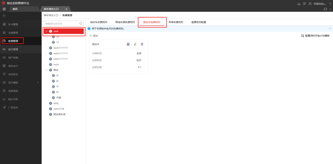 左侧选择收费管理,选择对应停车场,点击固定车包期规则,点击添加按钮