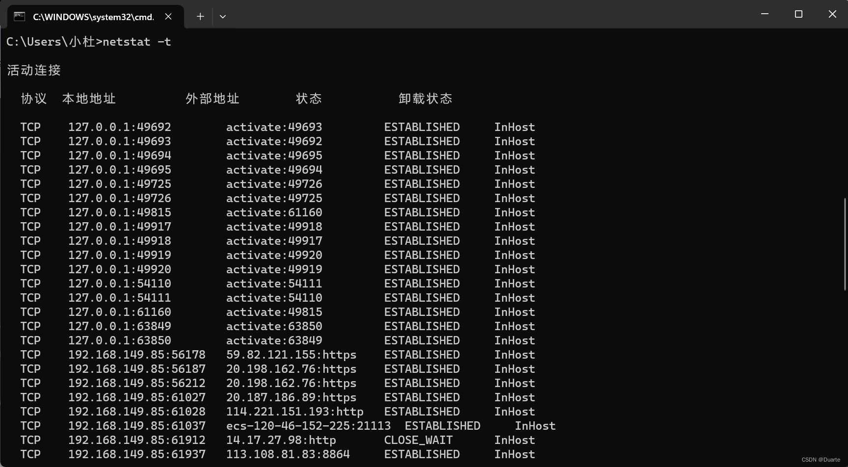 1、命令 netstat -na ,会显示本机连接情况及打开的端口