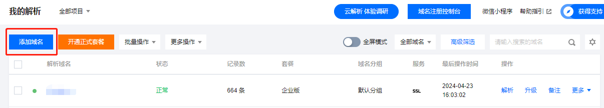 1. 登录 云解析 DNS 控制台,在我的解析页面中,单击添加域名,如下图所示: