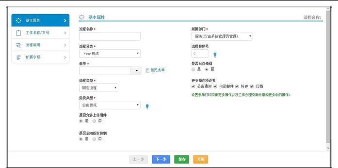 流程名称:流程名称可以根据公司所需的流程名称进行定义,流程名称不能重复。流程分类:对流程进行分类管理,便于流程的查找和修改。此处可选择的分类就是在【流程分类】里面设置好的。