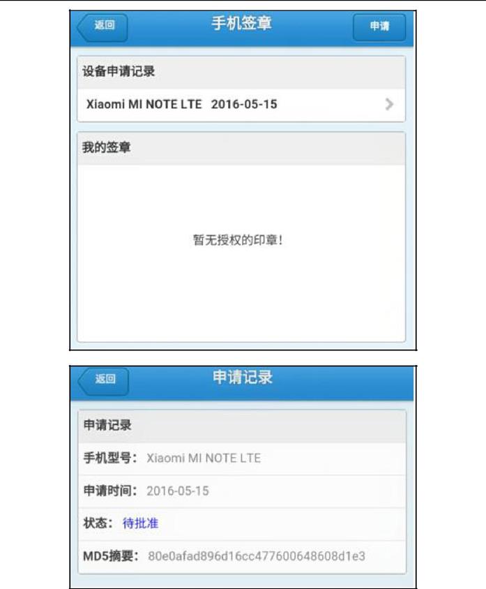 进入手机签章设置后,点击右侧【申请】按钮进行设备授权申请(此操作必须在设备上进行),申请记录会在下方列表中显示,点击每条记录可查看详情。