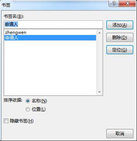 首先制作套红文件,做好基本的样式,选择映射数据的位置定好光标,选择"插入"—"书签",依次插入"申请人""申请时间"两个书签,保存为 dot 文件上传到 OA 系统。