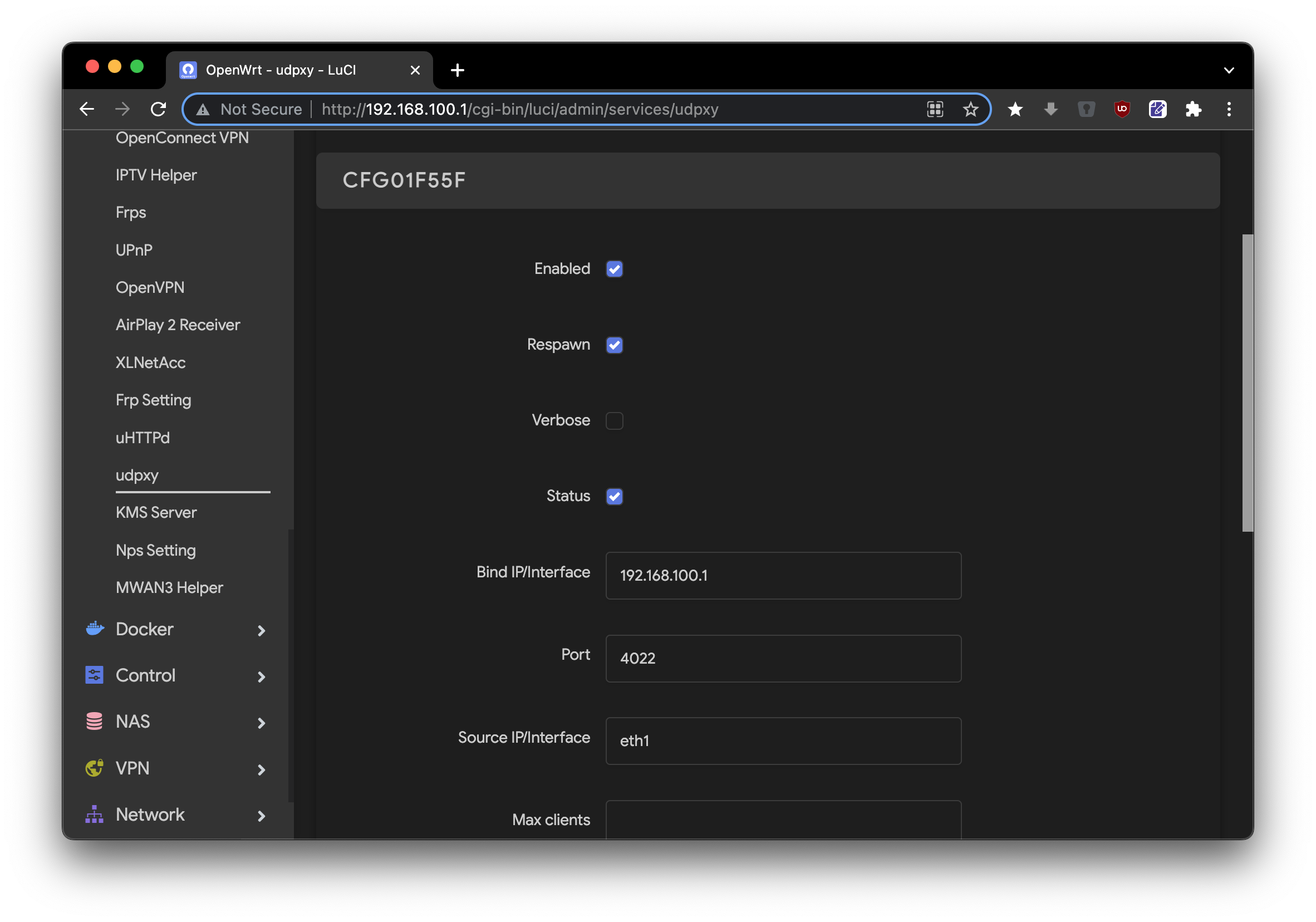 进入 服务 -> udpxy,启用并按图中进行配置,BindIP 为 OpenWrt 软路由 IP 或者 0.0.0.0 也可以,SourceIP 使用上面的 IPTV 的接口eth1,保存并应用。