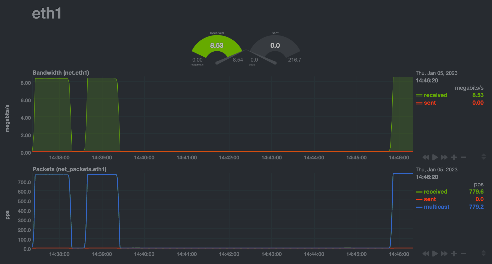 如果 OpenWrt 上有安装 netdata,在对应网口上也能看到在播放 IPTV 的时候,流量都是通过 eth1