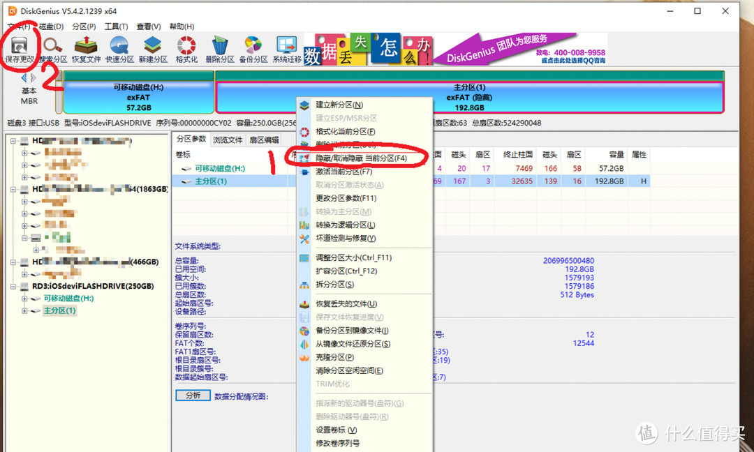 在第二个分区上右键选择隐藏当前分区,记得点击下保存更改。