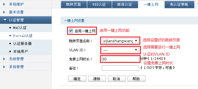 点击 认证管理 >> Portal认证 >> 一键上网,启用一键上网功能,跳转页面名称选择前面设置好的页面名称,选择需要进行一键上网认证的VLAN ID和设置通过认证可以免费使用WIFI的时长,如下图: