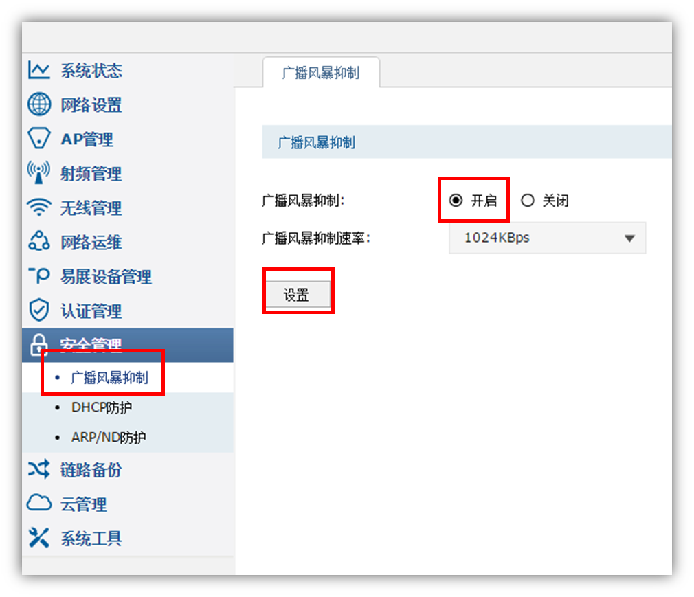 部分异常终端如:中毒电脑等设备可能发送大量广播报文影响无线网络的正常使用,建议使用广播风暴抑制功能减少网络中的广播包,如下图: