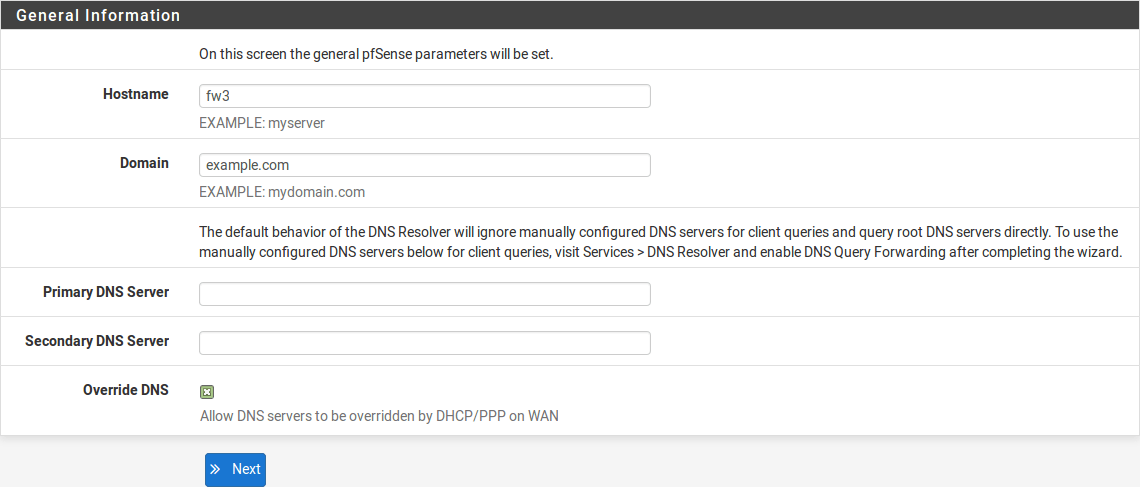 example.com。如果该网络没有域,请使用.localdomain,其中是另一个标识符:公司名称,姓氏,昵称等。例如,company.localdomain主机名和域名组合在一起组成该防火墙的标准域名。主要/辅助DNS服务器